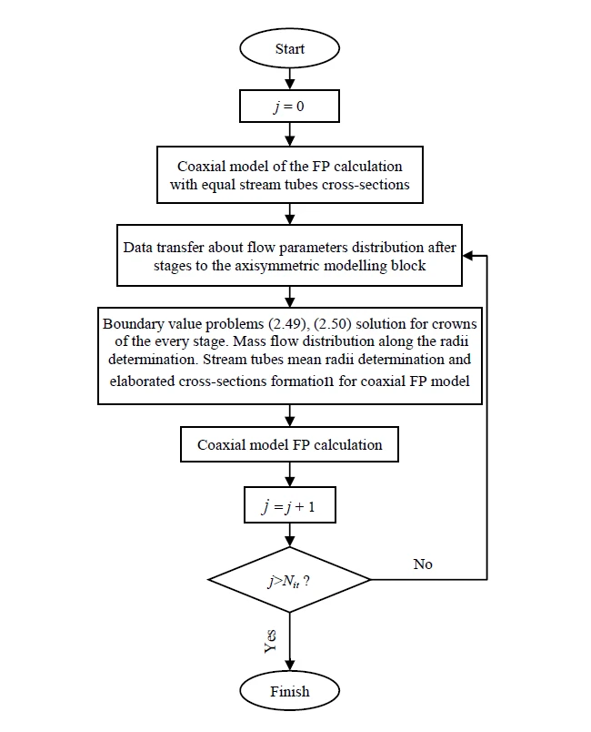 The FP calculation results using the algorithm corresponding to the coaxial model again transferred to the block of boundary problems solutions (2.49) and (2.50). Described iterative process continues as long as the results of the calculation for both FP calculation algorithms differ less than a prescribed accuracy. Thus, the FP coaxial model and boundary value problems (2.49) and (2.50) complement each other in solving the axisymmetric problem, eliminating the “alignment” on the results of the one-dimensional calculation and more adequately assess the value of disposable heat drop of FP stages.