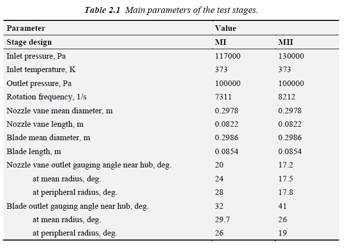 - the geometrical characteristics of the blades: entry and exit angles, as well as blades count in the crowns, the chord, edge thickness and other parameters necessary for determining the velocity coefficients along the blade length;