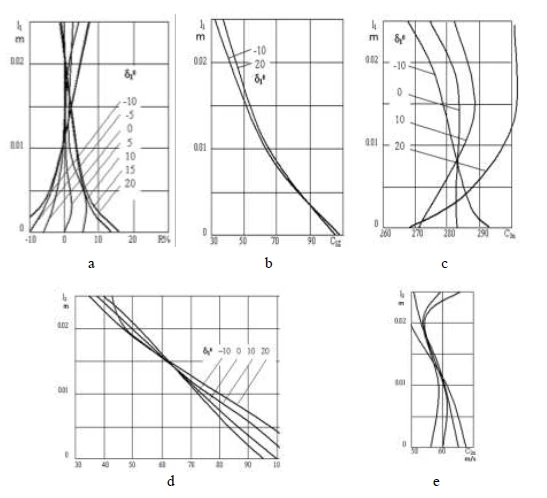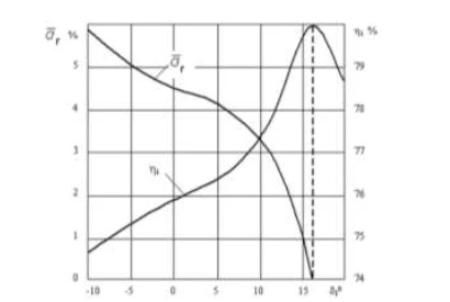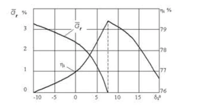 Calculations were performed to determine the effect of the nozzle tangential lean on the characteristics of the experimental air turbine stage with high load Dm/ι=14, with the value of the radial gap δr = 1.5 mm.