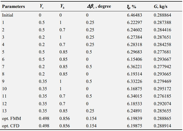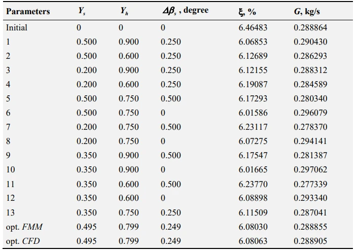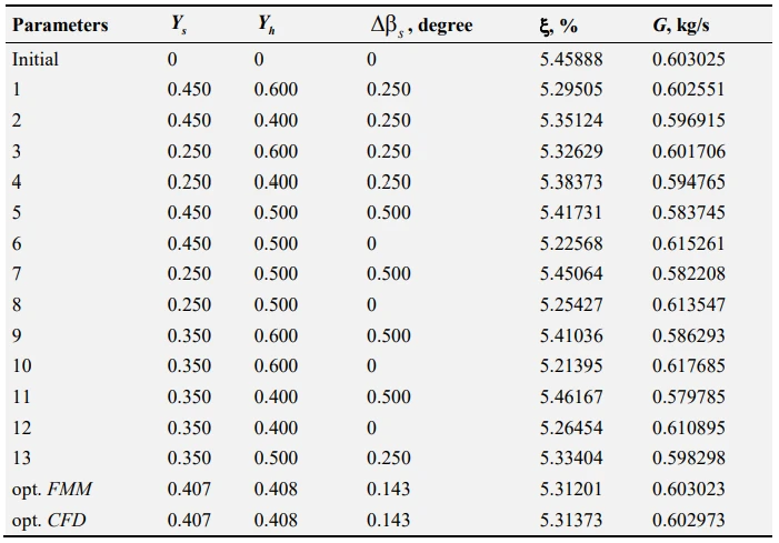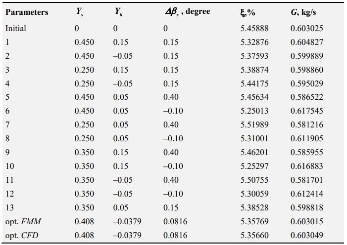A potential imperfection of the proposed optimization approach can be precision of the obtained FMM. Checking CFD calculation of optimal variant shows that the accuracy of the FMM is high because the objective function optimal values, projected by FMM, and restriction function with high enough precision coincide with their values received as a result of CFD calculation (divergence in ζ  is 0.005%, and in G – 0.017%). Differences of the mass flow rate in optimal and initial variant, based on the results of the CFD calculations, is 0.014%.