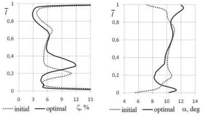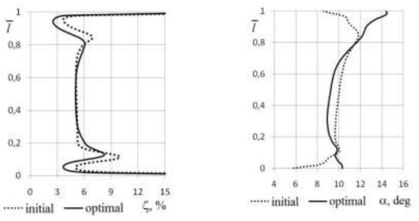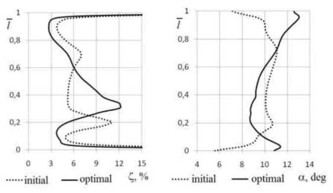 The distribution of the coefficients of losses and the actual outlet angles along the height of the blades for the initial and the optimal variants are represented at Fig. 6.27 and 6.28 respectively. These figures show that increasing of the losses in optimal variant took place in the central part of the cascade along with reduction of the losses at the end areas, while actual outlet angle, on contrary, decreased in the central part and at the end areas.