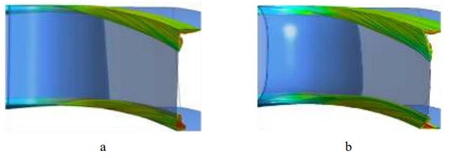 Figure 6.35 The move of the channel vortex on the suction side: а – initial cascade; b – optimal cascade using method 2.