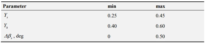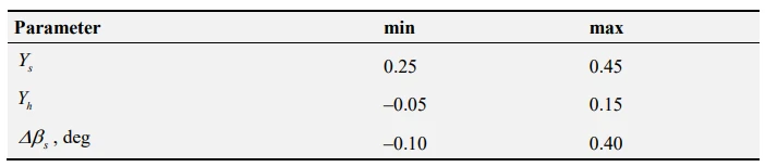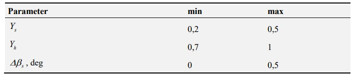 Table displaying parameters with columns for minimum and maximum values. Parameters: Yₛ (min 0.2, max 0.5), Yₕ (min 0.6, max 0.9), and Δβₛ, degree (min 0, max 0.5).