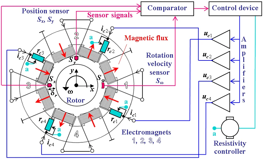 The active magnetic bearing control system measures rotor displacements in or near the bearing using special sensors, which transform these displacements into signals coming to a comparator and a control device (controller). In turn, the controller provides the bearing electromagnets with an adequate response in the form of changing current and, thus, the variable bearing stiffness. This response is enabled by specially developed control laws which differ from one machine design to another. Naturally, these laws are far from obvious and require deep studies. The control system of an active magnetic bearing combines mechanical and electromagnetic processes into one interconnected electro-magneto-mechanical process related to the dynamics of the whole rotating machine.