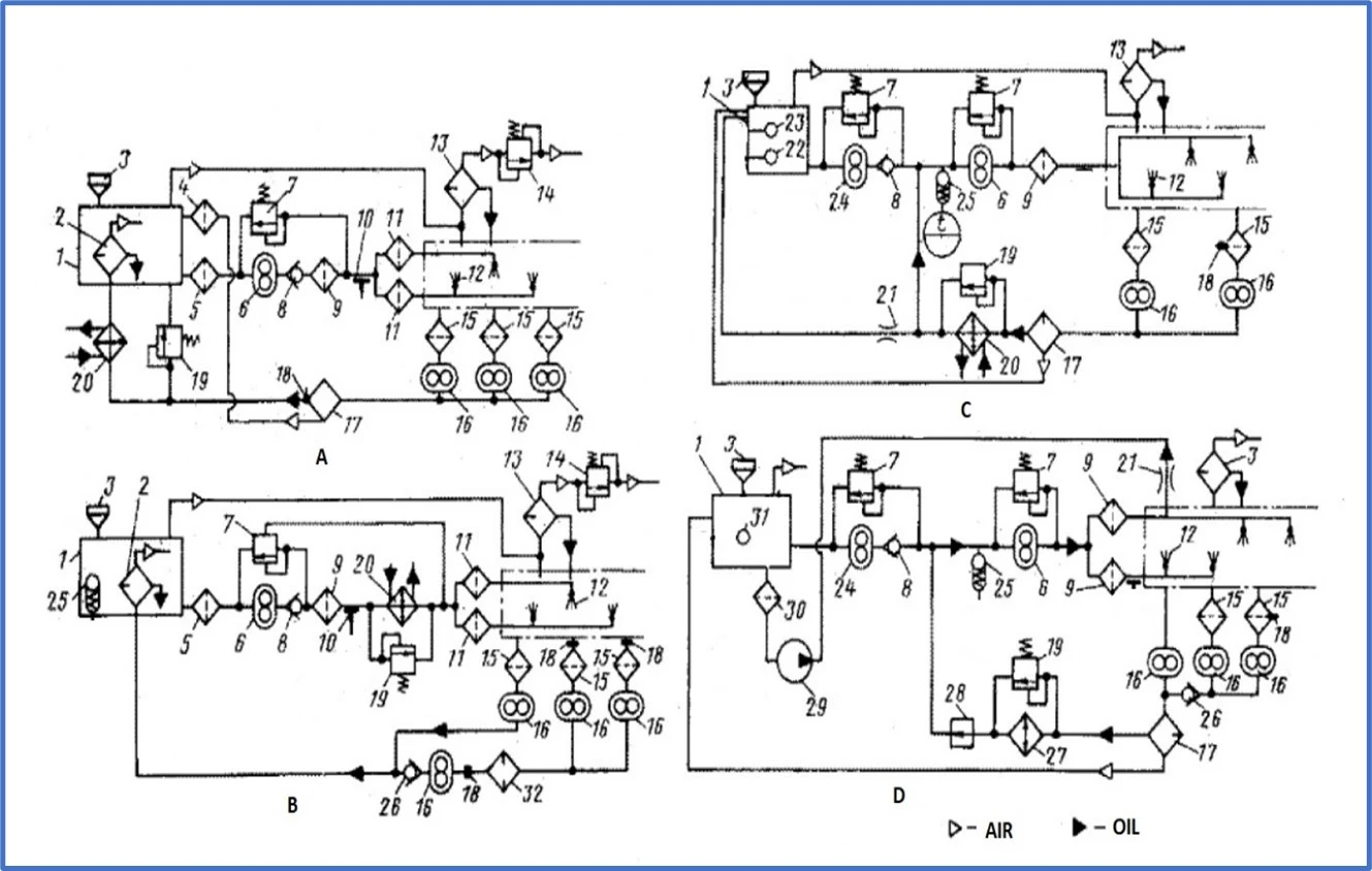 There are various schemes for the layout of circulating oil systems. The most common is a single-circuit scheme with a heat exchanger in the scavenge line (type A), or with a heat exchanger in the supply line (type B). Single-circuit systems are often used when the oil tank capacity is low. In addition to single-circuit schemes, there are two-circuit ones (type C) and short-circuit ones (type D). The use of single-circuit systems becomes difficult in engines with a long operation time, and in high-power turbojet and turboprop engines. In such cases, two-circuit schemes are used. These allow the oil to move according to the “engine-heat exchanger-engine” scheme, and only a small portion of the oil (10–20%) returns to the tank. Short-circuit systems are similar to two-circuit systems, and have become widespread in turboprop engines.