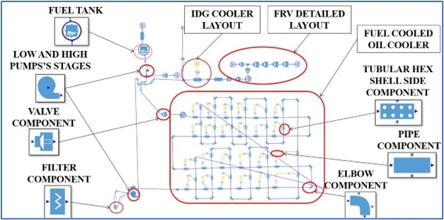 Each oil/fuel pipe can be discretized at different levels of abstraction, in order to obtain an accurate distribution of results through the fluid network. Desired temperatures cannot be reached unless the thermal task in the heat exchanger is highly precise. To achieve this, heat exchanger fluid and surface paths can be modeled in detail and added to the entire scheme for analysis. The heat transfer coefficients can be calculated automatically according to the appropriate correlations for each task.