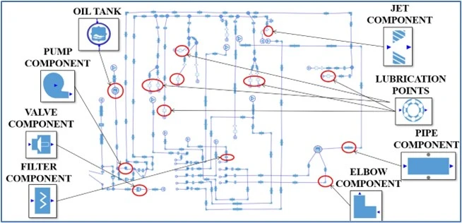 Lubrication system design and analysis are very important tasks which involve a number of complex iterations in steady-state and transient conditions. The arrangement of the system depends on engine type, its purpose, size, working regimes, the influence of radial and axial loads on the system and the load order, bearings selection, lubricant, thermal management, design of geometry arrangements and equipment selection, and analysis of fluid dynamics and heat transfer processes in the system. To cover all these different tasks, a 1D thermal-fluid network modeling approach can provide the necessary calculation accuracy while decreasing the time spent exploring design iterations under different conditions.