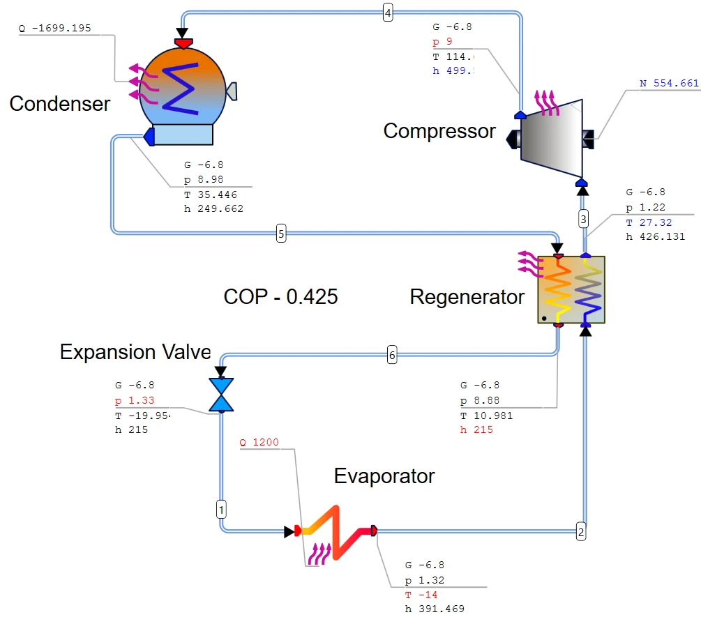 Figure 2 Example of refrigeration cycle in AxCYCLE™ to determine component boundary conditions required to do their design, calculate COP, etc.