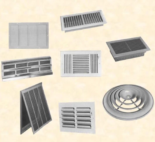 The different branches in the model above are of varying physical lengths, cross-section shapes, and dimensions. They are sized to provide the desired amount of air to each outlet. Additionally, the grilles, registers and diffusers (GRDs), which are not presented in the schematics above, can be modeled to determine more accurately how much flow will be delivered at each location. Such level of detail also allows designers to determine the GRDs and ducting pressure losses (flow resistance) which are essential data points needed to properly size the fan and motor. Different types of GRDs are shown in Figure 4. Oversizing the system would result in increased purchase costs, reduced operating efficiency, excessive wear/maintenance, noise, etc. Undersizing the system would lead to improper control of the comfort conditions such as not being able to provide the desired amount of cold air on a very warm day.