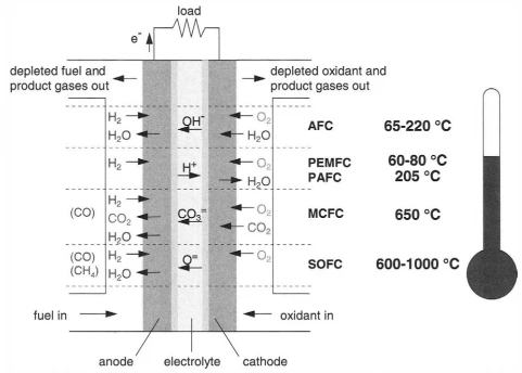 Figure 3 shows the types of fuel cells, reactions, and temperature modes of operation.