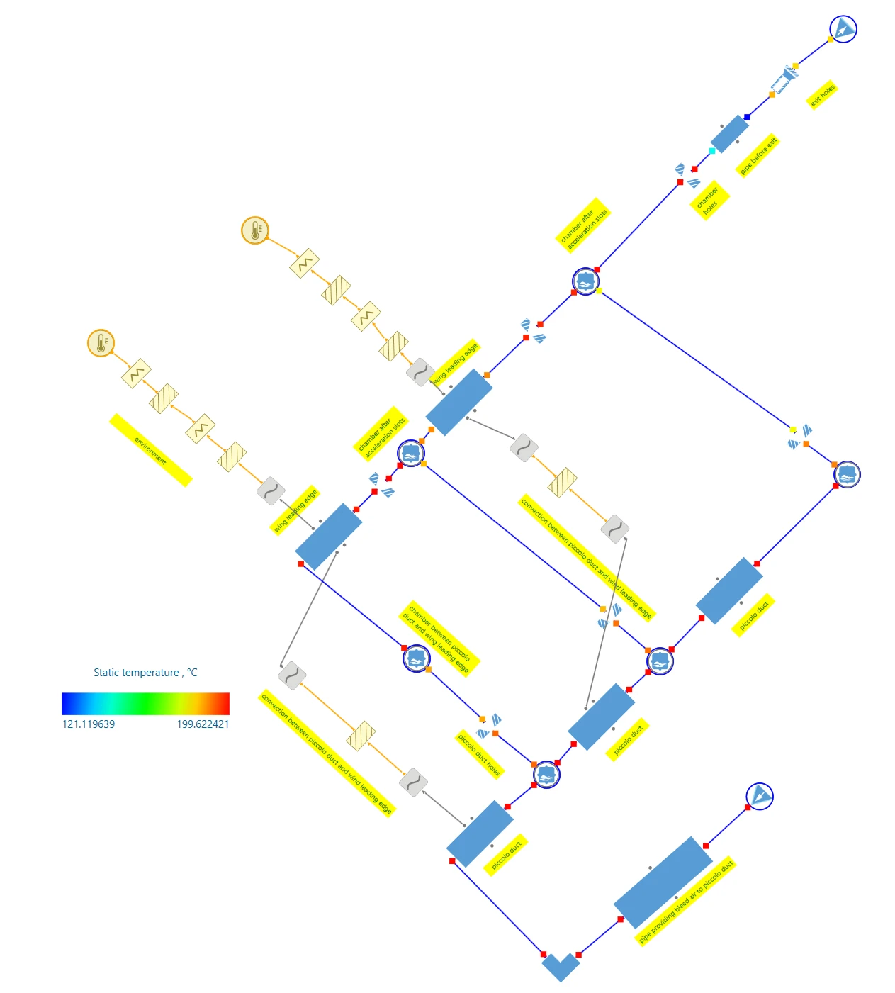 The temperature profile in the pneumatic system can be seen through the coloring of the fluid ports (squares at the end of each element) in Figure 4. Here, no thermal losses were accounted for in the telescoping pipes and piccolo duct so maximum thermal energy could be transferred to the wing leading edge (best case scenario, although alternatives can also be simulated).