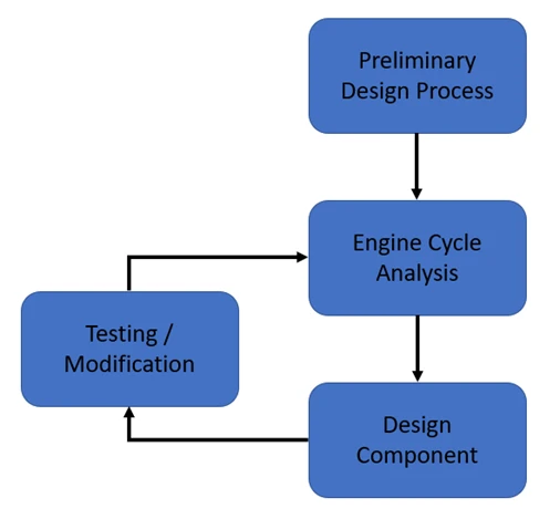 In general, engineers have two options to develop a better engine. The first is to create a completely new design, like implementing a geared turbofan, which takes a lot of time and research. An example of this is the PW1000G engine from Pratt and Whitney, which was in development during the late 1990s and had its first flight test in 2008 [1]. This approach is less common which is reflected by other manufacturers who are backing down from the idea of using geared turbofans due to weight and reliability concerns [2]. The second option and this is the common method, is to gradually improve existing engines. This however brings new challenges, because simply improving one engine component does not necessarily mean that part of the machine will work well together with the rest of the machine. Furthermore, the design process for aero engines is very time-consuming. A general overview is shown in Figure 1. The process starts with an assumption for certain performance characteristics, for example, efficiencies for a compressor. After that, a cycle analysis is performed where the design point and off-design behavior are determined. With the newly gained information, the design process of the single component takes place. Upon successful creation of the component which satisfies all requirements, the process moves to the test phase. In this phase, the designed machine will be evaluated through experimental testing or intensive CFD studies. Modifications will be made if necessary to reach the desired operating conditions. Since changes were made to the geometry, these changes need to be investigated in an additional cycle analysis to understand how they will affect the overall engine performance. This process repeats until a converged solution is found.