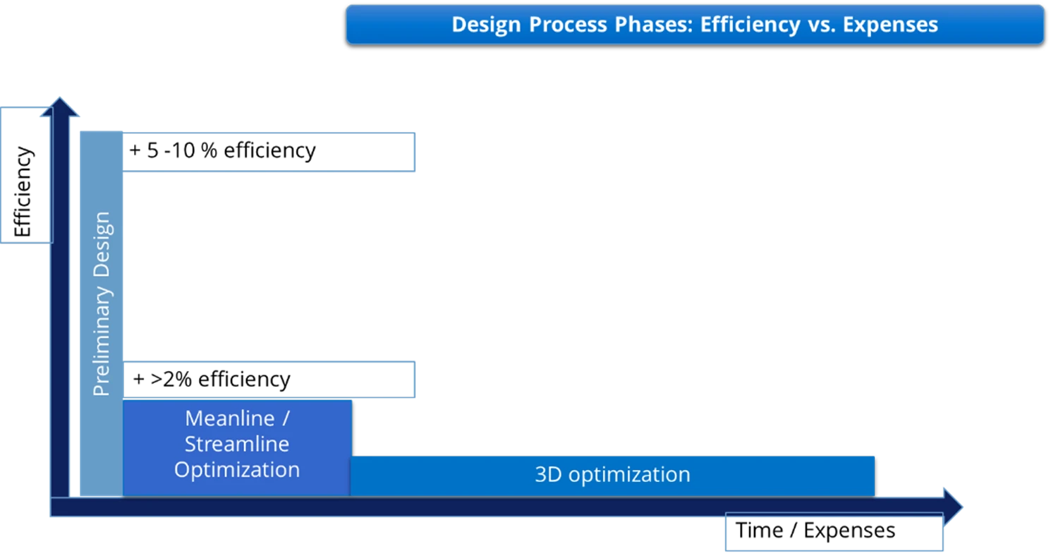 As one can imagine, the engine design and performance modeling process is a very time-consuming task, and the challenge is to find an appropriate balance between modeling accuracy and time. Therefore, it is very beneficial to improve the overall design process. One way to do this is to work with an initial geometry instead of empirical assumptions. The reason for that is that the efficiency of the preliminary design process, ergo the determination of a good initial design, is significantly higher compared to later stages of the design process. Figure 3 shows the relation between time spent and potential efficiency increase. 3D optimization is very time-intensive and if the design is found to be inadequate in this step, will result in the process starting all over. With this in mind, it is crucial to start with a well-suited geometry which reduces the risk of a complete restart.