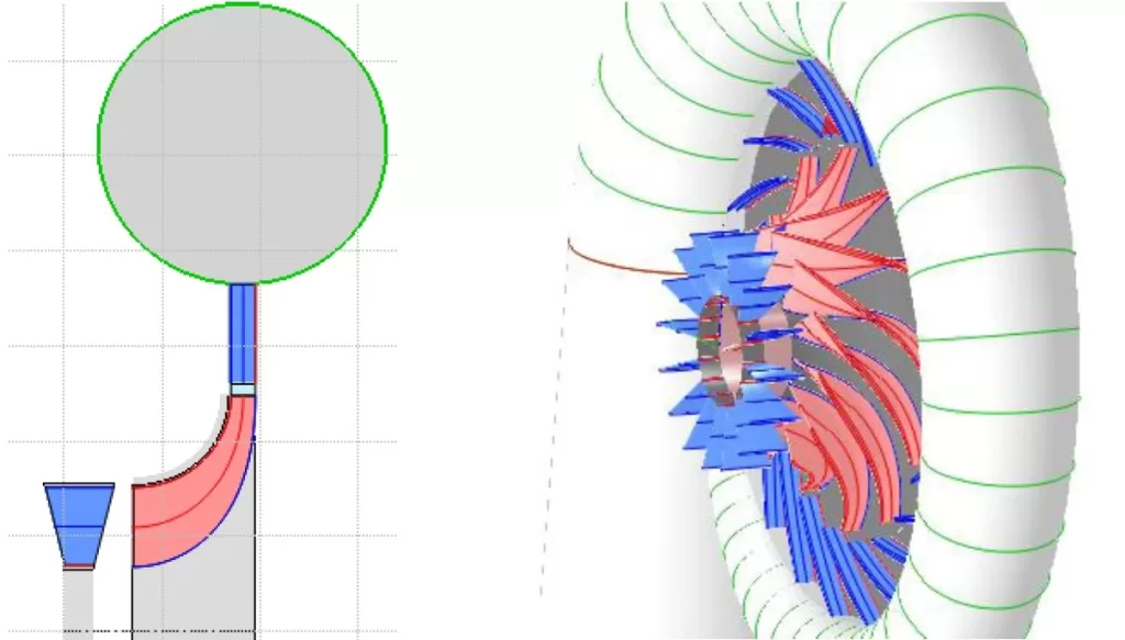 After setting all data information like tip/hub diameters, number of blades, clearance, stacking mode for 3D blade, etc., you will be able to see the flow path and 3D models in a graphic interface, as shown in Figure 3.