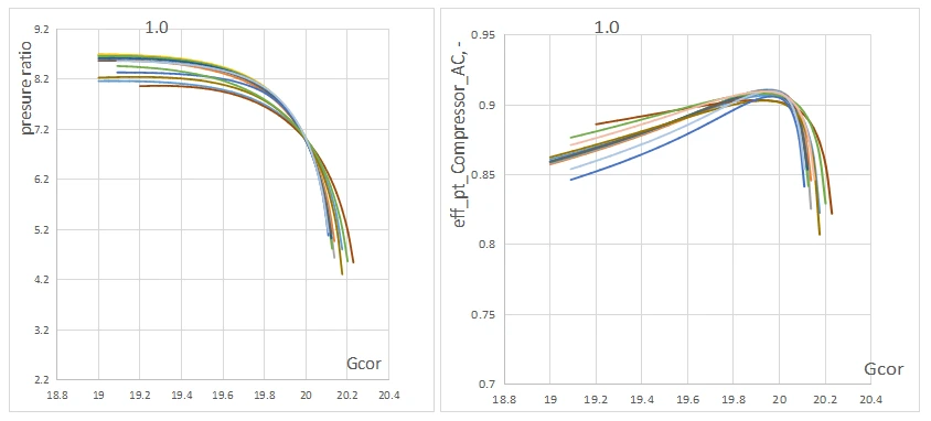 Since the requirements for the compressor at lower frequencies are set by the output system, it is possible to choose the distribution of work between the compressor stages in the design mode so that it is not necessary to turn the compressor blades from the design point to the 2nd point at low or high frequencies. This will allow you to choose the distribution of work between the stages, which will expand the range of operation of the compressor. Calculations must be made for a specific compressor. In this case, the nuances of the compressor flow path and the presence of supersonic stages were taken into account. Analysis and change in the distribution of work between compressor stages can reduce the number of transonic or supersonic stages, which can increase efficiency.