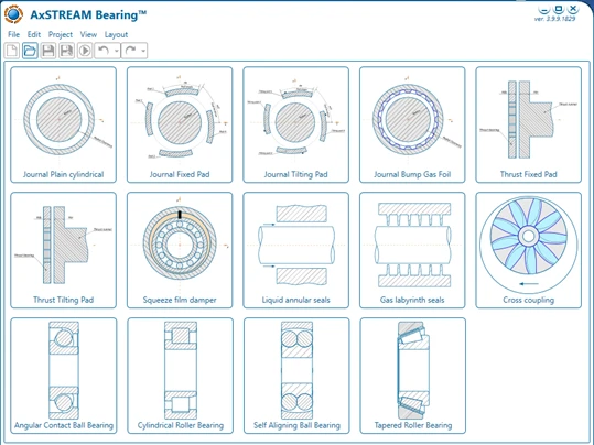 All the above-mentioned bearing types and design considerations can be accurately modeled and analyzed in AxSTREAM Bearing™. Additionally, AxSTREAM Bearing™ can be used to determine bearing characteristics that are necessary with regards to rotor dynamic analysis, including bearing stiffness and damping characteristics. AxSTREAM Bearing™ allows designers to determine hydrodynamic and mechanical characteristics for different types of hydrodynamic journals and thrust bearings as well as auxiliary component characteristics such as liquid and gas seals, squeeze film dampers, and aerodynamic cross-couplings. Figure 2, shows the variety of bearings and auxiliary components available for analyzing in AxSTREAM Bearing™.