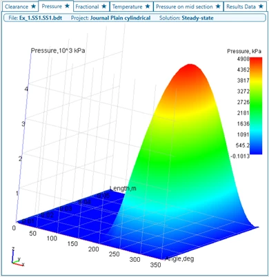By using AxSTREAM Bearing™, designers can perform numerous analyses using the “Finite Difference Method” which includes, steady-state and transient analysis, whirl stability, and bearing map analysis. In bearing steady-state analysis, designers can determine the pressure distribution, friction coefficient, friction power loss, oil flow rate, oil temperature increment, minimum oil film thickness, temperature distribution, eccentricity and angle, fractional film content, Sommerfeld number, critical mass, and mechanical characteristics (stiffness and damping coefficient). One such examples of journal bearing simulation in AxSTREAM Bearing™ is shown in Figure 3.