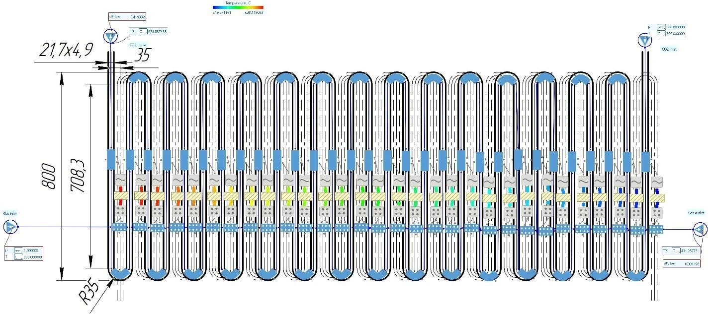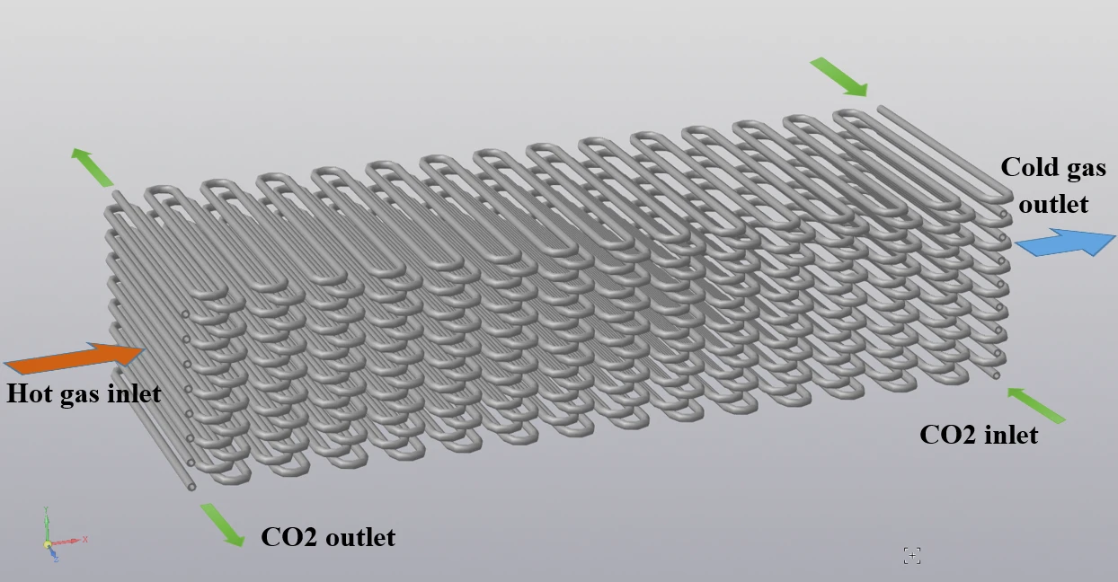 We can see that the design consists of an array of staggered microtubules, inside of which CO2 moves. These tubes are located inside a rectangular channel through which combustion products move. The heating gas and CO2 flows have a common countercurrent flow, although each tube is perpendicular to the gas flow.