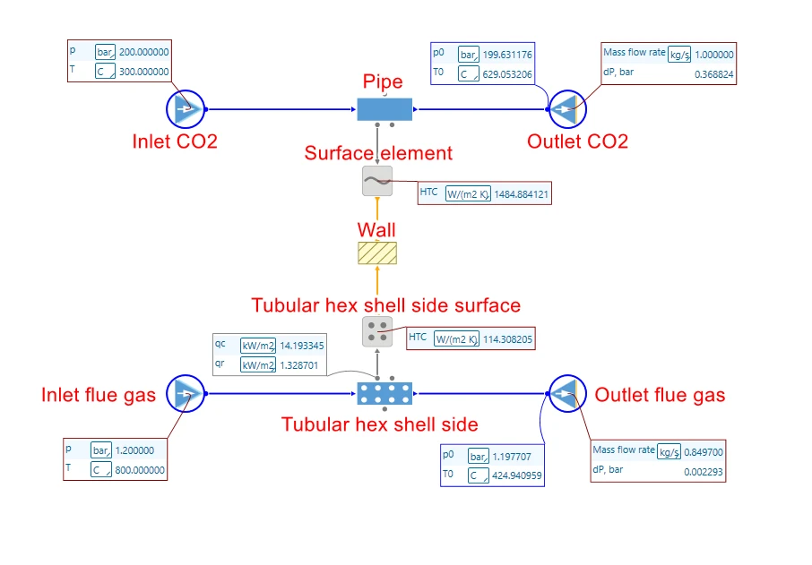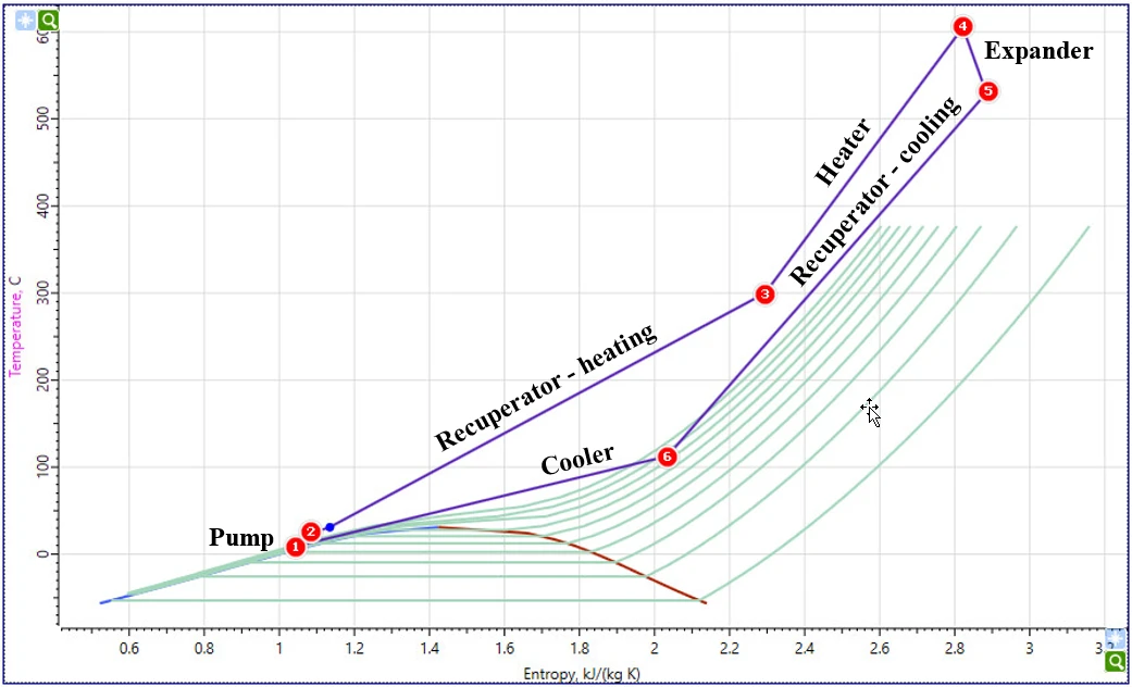 So how does all of this come together? Figure 1 demonstrates a Supercritical CO2 power cycle with heating by flue gases modeled in AxCYCLE™. This installation is designed to utilize waste heat after some kind of technological process. The thermal potential of the exhaust gases is quite high (temperature 800° C). Therefore, at the exit from the technological installation, a Supercritical CO2 cycle was added to generate electrical energy. It should be noted: if the thermal potential of waste gases is much lower, HRSG can be used. More information on HRSG here: https://www.softinway.com/en/introduction-to-heat-recovery-steam-generated-hrsg-technology/