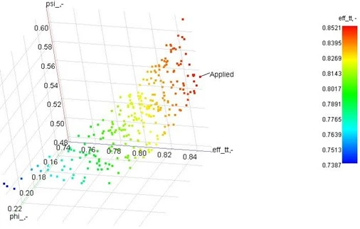 The key design requirements were input into the AxSTREAM® code, and the pump overall efficiency was specified as the optimization parameter. The code uses an inverse solver in which the overall pump performance is input in terms of design point flow rate and head rise, while the ranges of several design parameters and geometric constraints are also specified. The shaft speed of 2,500 RPM yielded a flow coefficient of 0.66 at 2,500 RPM and resulted in obtaining a pump design with the best efficiency point of 85%. Figure 2 shows the design space explorer illustrating the range of designs that could meet the design requirements, and the “applied” design, which was selected since it had the highest overall efficiency. The selected pump design has a flow coefficient of 0.63 and an overall efficiency of 85% at the best efficiency point.