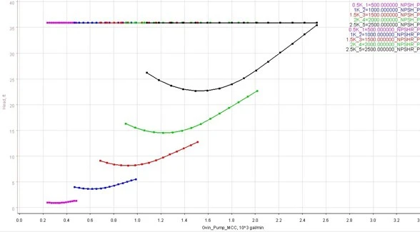 Figure 12. The reduced pump inlet pressure of 16 psia results in NPSH available that is just above the NPSH required at the highest flow of the 2,500 RPM speed line.
