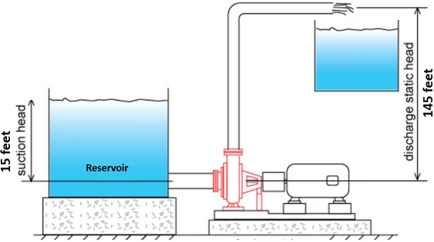 Figure 1. The pump installation showing the water reservoir feeding the pump inlet with a 15 feet total suction head, and the discharge tank that is at a height of 145 feet above the pump.