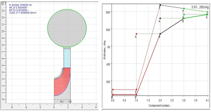 Figure 3a. Meridional flow path from the preliminary design optimizer module. 3b. Stage entropy rise.