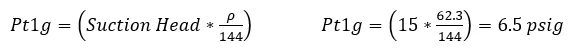 To start the design of the pump, we need to calculate the inlet pressure based on the 15 feet height of the column of water in the supply reservoir and convert it to pressure in terms of pounds force per square inch (psia). The inlet gauge pressure Pt1g in units of psig is calculated from the total suction head of 15 feet high water column in the supply reservoir. using the following equation, where ρ is the water density is 62.3 lbm/ft3.