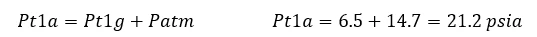 The inlet gauge pressure is then converted to absolute pressure by adding the atmospheric pressure Patm at sea level of 14.7 psia, to obtain the inlet pressure Pt1a = 21.2 psia at the eye of the pump.