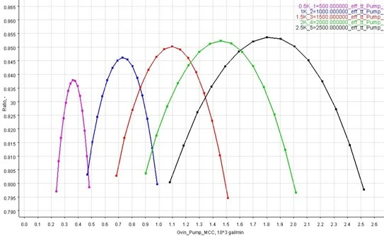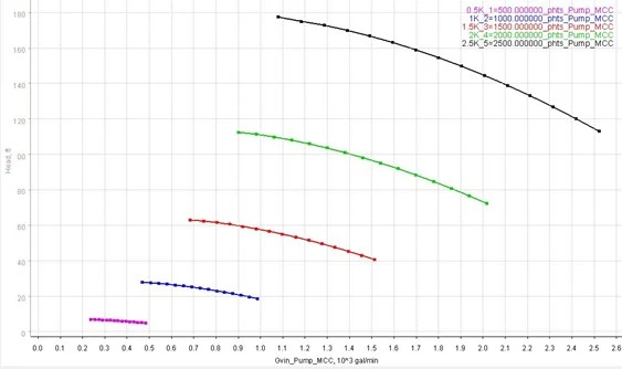 Figure 8. The static head rise of the pump at the 2,500 RPM design speed, and at four lower speeds in 500 RPM increments.
