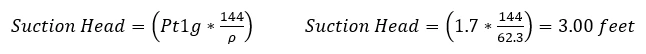 Knowing the minimum inlet pressure that will still produce adequate NPSH available, we can now calculate the height of water in the reservoir that would produce the pump inlet pressure of 16.0 psia. The pump inlet pressure Pt1a = 16.0 psia is equivalent to Pt1g = 1.7 psig above atmospheric pressure at sea level. Using the previously mentioned equation, but rearranging it to solve for suction head, the height of water that produces Pt1g = 1.7 psig, is calculated as follows.