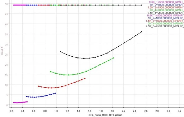 After the design of the pump meets the design performance goals, the next part of the design process is to generate a characteristic map at several speed lines. Static head rise as a function of shaft speed and flow rate is presented in Figure 8. Figure 8 shows the design point performance was met at 145 feet of static head rise at 2,000 GPM at the 2,500 RPM design speed.