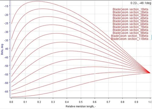 The distribution of the impeller blade angles from the inlet to the outlet for all 11 streamline sections is shown in Figure 6. The change in beta angle near the impeller tip in the first 10 to 20% of the blade meridional length is low and on the order of 1 – 2 degrees. This means that the fluid dynamic loading is likewise low at this region, and therefore is a favorable design from a suction performance perspective.